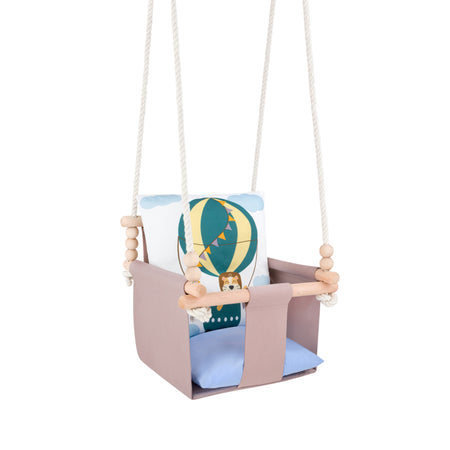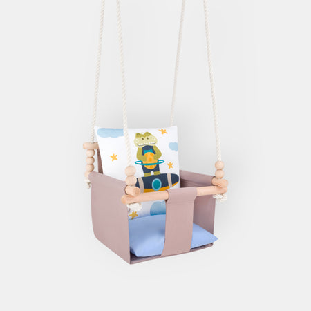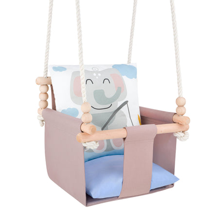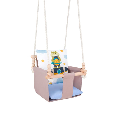 Every indoor swing features premium construction with sturdy wooden components and reinforced cotton materials, supporting up to 20 kg. OEKOTEX 100 Class I certified materials ensure a safe swinging experience for children aged 9 months and above.